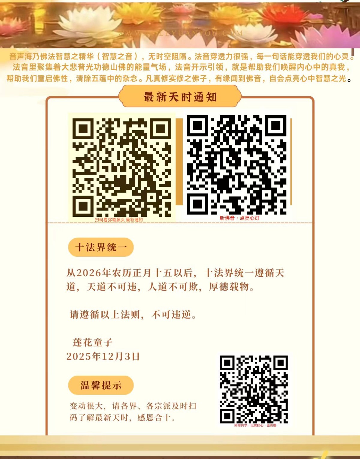 附:往期通知,大家多看看,这些通知是观世音菩萨亲自下的,都是利益我们普罗大众的。也不能只看,同时要要纠正自己不正确的行为习惯,这个是针对所有法界的,不要以为只是给别人的,每个人都在天管之下,真的要好好修正自己了,再不改连人都做不了。能传给身边的人更好,良好的社会环境需要我们大家从自身做起来共同创建和维护。