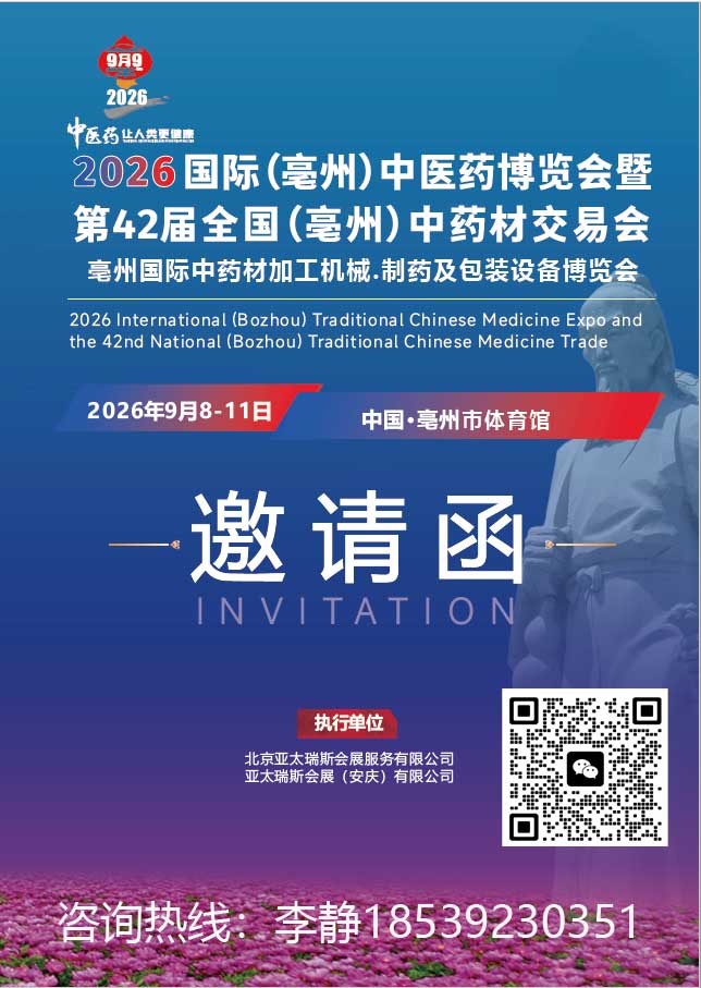 2026国际(亳州)中医药博览暨第42届全国(亳州)中药材交易会定于2026年9月8日至11日在亳州市体育馆举办。展会将继续承华佗遗风,循神农本草之道,持续聚焦中医药前沿,广拓国际视野,深融跨界交流,广结合作良缘,为亳州市周边提供一个考察供应商、采购设备和综合解决方案的一站式选择平台。