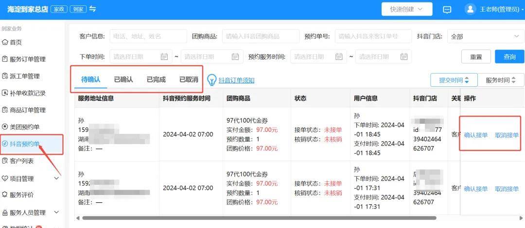 首先,通过熊猫到家云系统对接来自抖音等渠道的订单信息,可以自动同步家政公司自己的后台。
