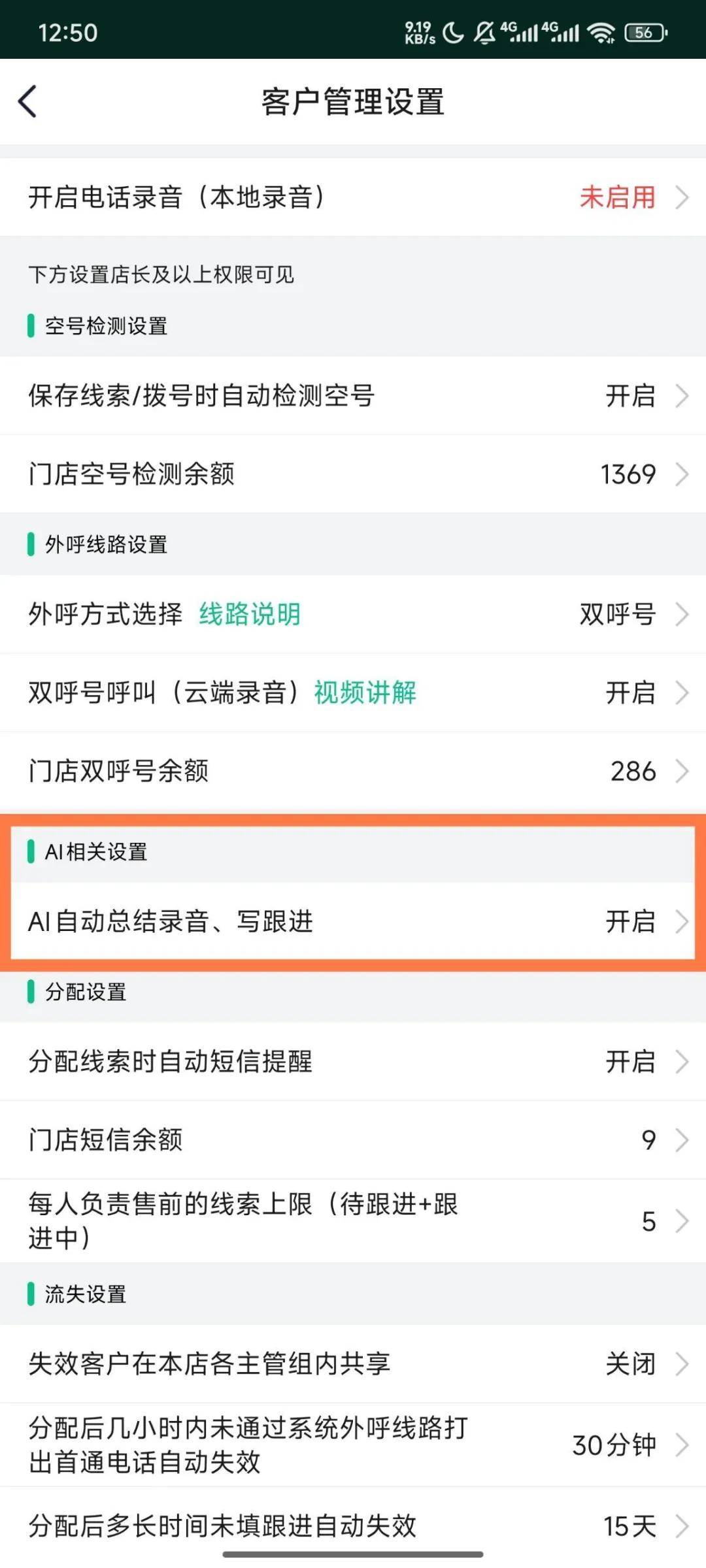 通话建立后,系统的价值进一步延伸。当管理员同步开启“AI自动总结”开关后,每一次通过系统外呼线路完成的通话都会被自动录音。