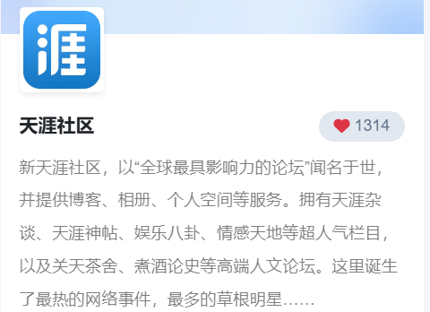 新天涯社区,以“全球最具影响力的论坛”闻名于世,并提供博客、相册、个人空间等服务。拥有天涯杂谈、天涯神帖、娱乐八卦、情感天地等超人气栏目,以及关天茶舍、煮酒论史等高端人文论坛。这里诞生了最热的网络事件,最多的草根明星……