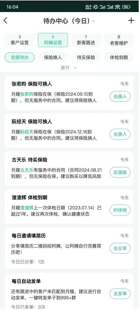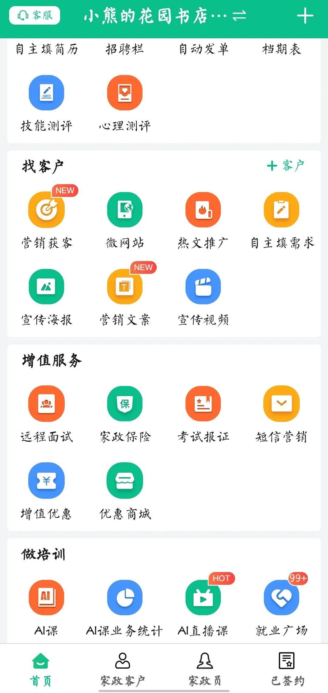 除了最热门的AI工具,还有包括家政体检、三方保密面试、阿姨简历、信用查询、线上签约、合同管理、客户管理等多种实用工具,帮助家政公司降本增效!