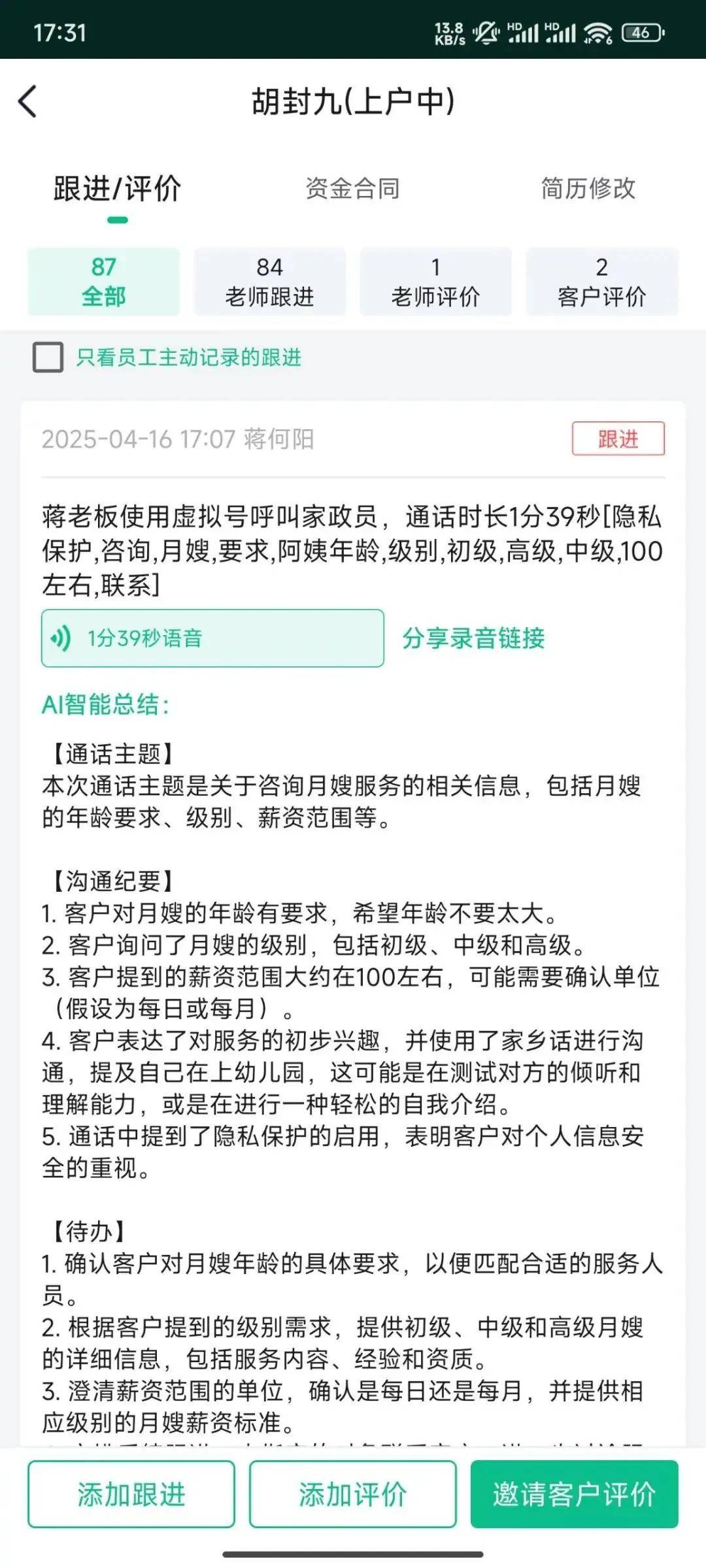 销售打出的电话自动录音,录音结束后,AI自动文字总结不需要一个一个听就能了解通话内容。