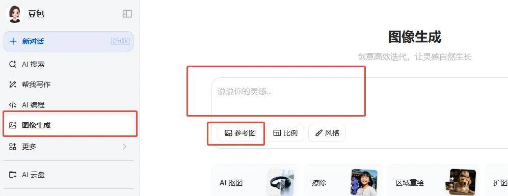 1、在侧边栏点击“图像生成”,如果是制作形象照的话,需要上传一张人脸的参考图,