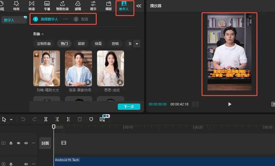 打开剪映,找到右上角功能栏的“数字人”功能,按照引导,第一步选择形象和声音,第二步输入数字人要说的文案,然后就能一键生成了。