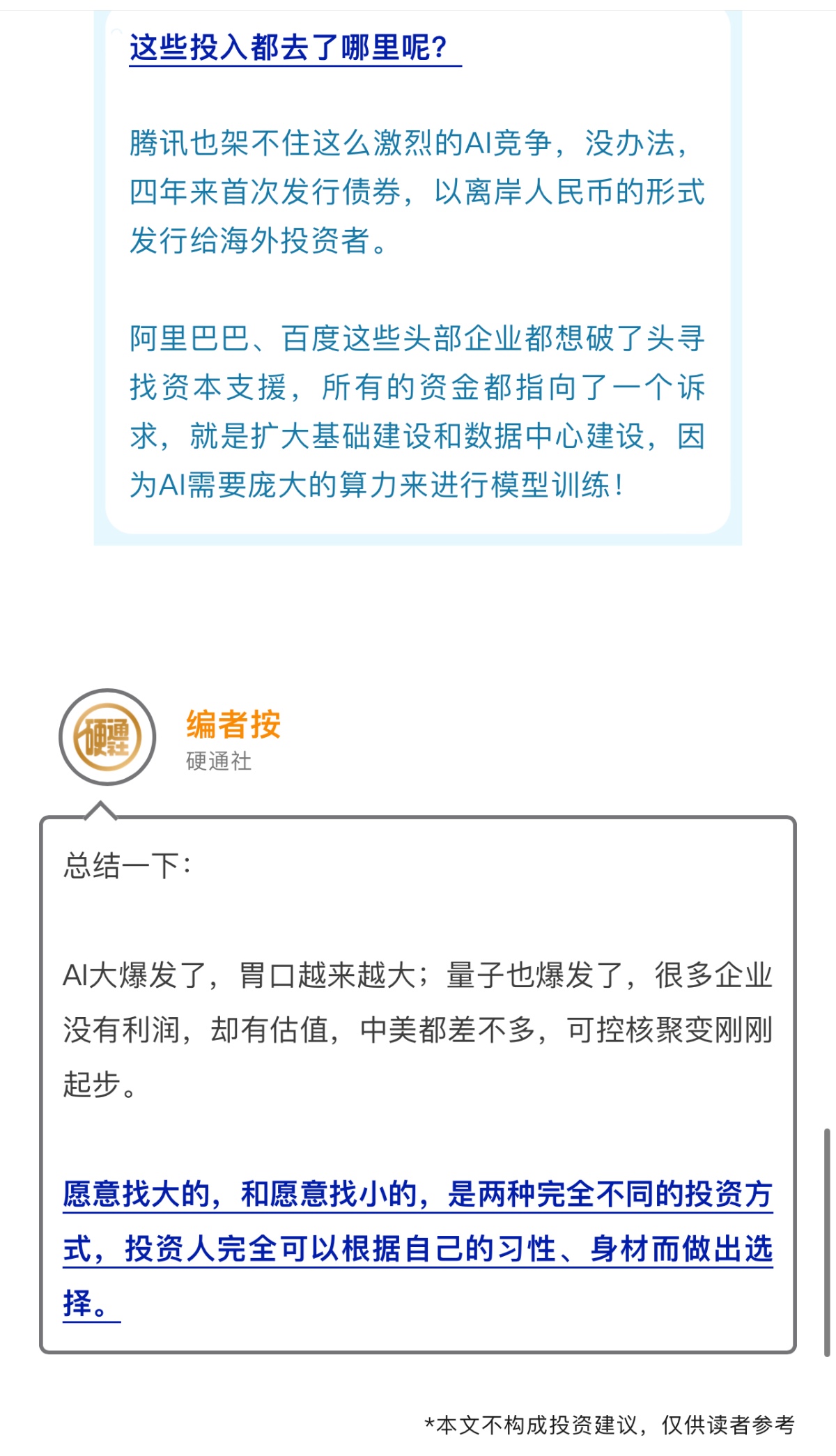 在这种市场里,资金一定会朝着绩优、有潜力的企业方向去,因为现在的黑科技都相当烧钱,不止AI,与其说拼高科技还不如说拼高科技+资本,没钱就没高科技。只有资本成就了高科技,才实现了资本的价值。 这一轮高科技就是国运,所以资本也必须要上!
