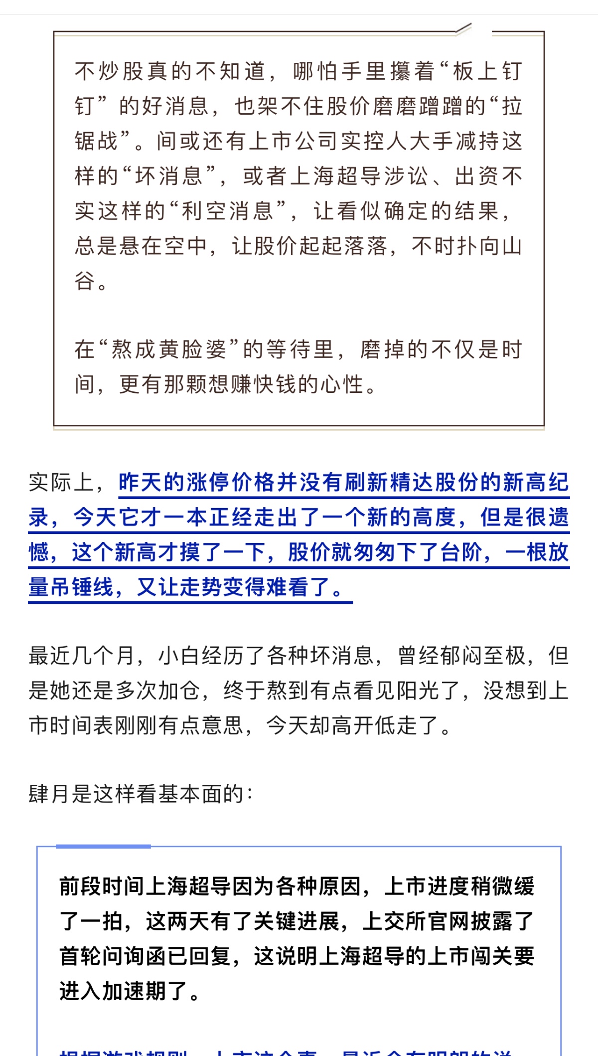 从6月份开始发酵,到现在也有快6个月了,大概有个50%以上的浮盈吧。如果要是来回折腾干不赢这个50%的收益,还不如在这种高确定性里面。好像绝大多数人算的账是,6个月,可能可以追上好几个10cm或者20cm,但是结果是不是这样呢?要看能力。不过,精达股份应该还没有发力。