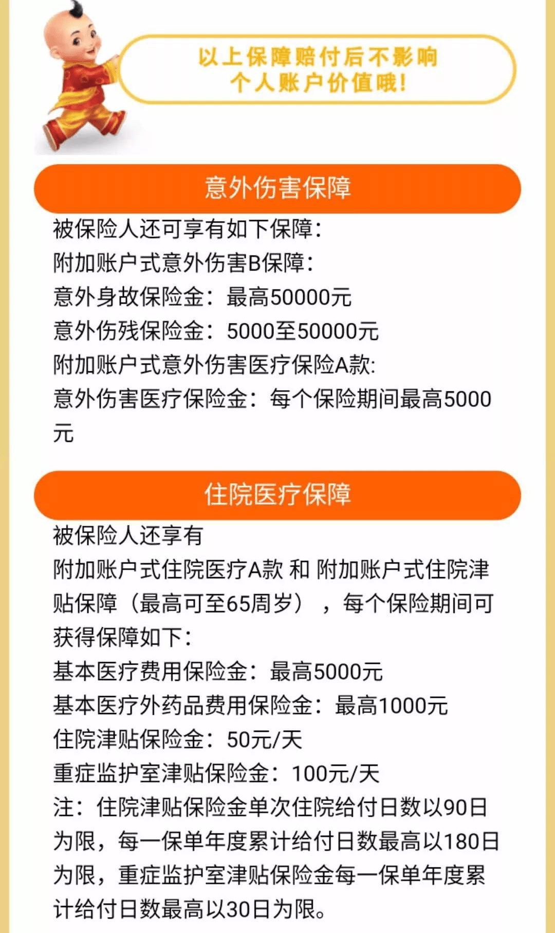 • 作用:比如家长交了 5 年,第 6 年出事,剩下 5 年的 40000 元就不用交,孩子的保障继续;