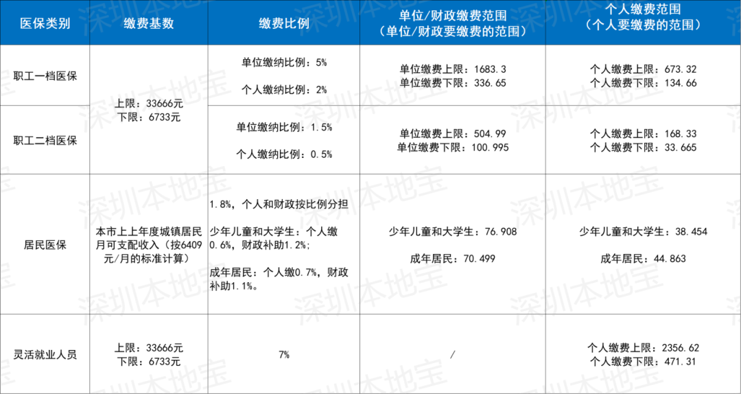 1. 养老保险:从 2024 年 7 月 1 日至 2025 年 6 月 30 日,全省企业职工基本养老保险缴费基数上限调整为 27501 元,深圳的缴费基数下限为 4492 元 。在缴费比例上,深圳户籍的朋友,单位要交 16% + 1%(地方补充养老保险),个人交 8%;非深户的话,单位交 16%,个人同样交 8%。像咱普通上班族小张,月工资 5000 元,在这个缴费基数范围内,他每月养老保险个人缴费就是 5000×8% = 400 元。
