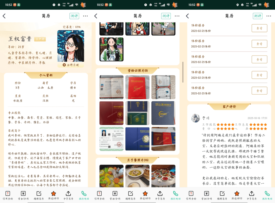 当我们需要向客户推荐时,不再是发去一段密密麻麻的文字,而是可以通过系统,直接分享一份阿姨的电子简历,包含上户经历、工作成果展示和过往客户的好评,让推荐变得有血有肉。