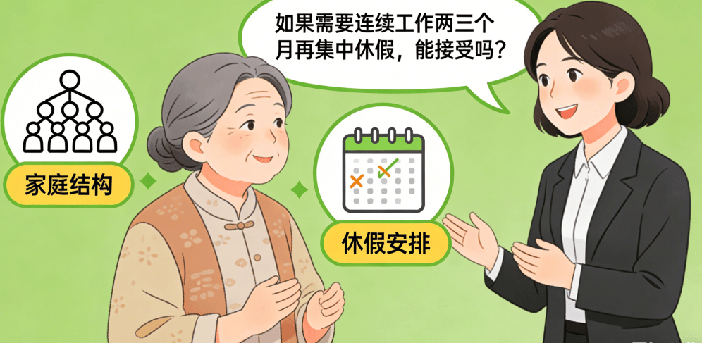 最关键的,要明确询问:“如果需要连续工作两三个月再集中休假,能接受吗?”很多高端或涉外家庭正有此需求,提前确认,避免上户后的矛盾。