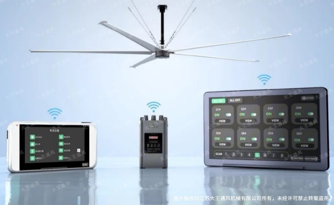 值得一提的是,一线品牌还为永磁同步电机搭配了集成物联网的智能控制系统,进一步放大“关键部件”的价值。该系统支持远程监控电机运行状态、精准调速,还能实现与车间空调的联动控制:温度适宜时仅开吊扇完成空气循环,高温时段协同空调运行降低整体能耗,打造智能化车间通风方案。以大王通风W.FANS系列工业吊扇为例,其搭载的智能管控模块适配永磁同步电机,可实现同车间/区域风扇集中管理,支持统一设定转速、定时开关机及手机APP远程操控,结合专属扇叶设计与高效永磁电机,实现节能与静音双重优势,适配多场景低噪节能需求。
