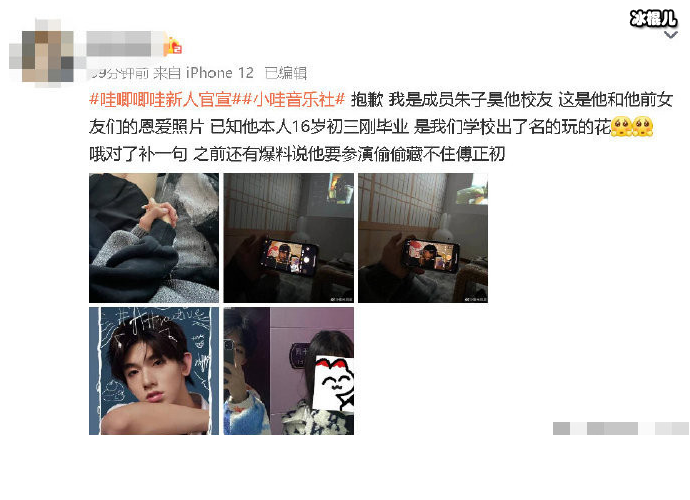 然而,令人措不及防的是下午就疑似塌房,是成员朱子昊和戴翔陷入争议。一位叫“雾元冯丽”的网友发文爆料,称与朱子昊是校友,16岁刚毕业,是学校里出了名的玩的花,并晒出了朱子昊与他前女友们的恩爱照片,从照片中看挺甜的。最后还爆料朱子昊出演《偷偷藏不住》,剧中饰演傅正初。据赵露思官方后援会所属账号,因疫情原因开机延后。