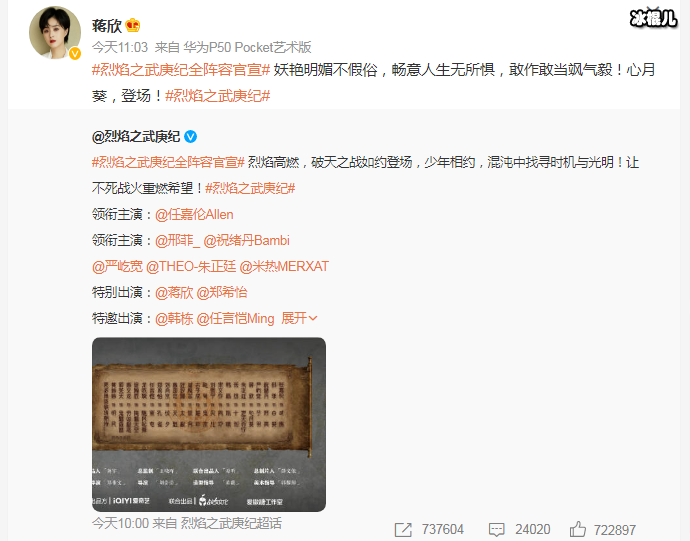 以上就是【《烈焰之武庚纪》全阵容官宣 蒋欣出演饰演心月葵】的相关内容,喜欢《烈焰之武庚纪》的朋友可以期待一下,后续更多资讯小编也会分享给大家。