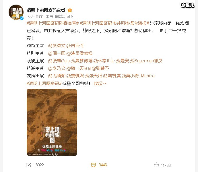 据悉,张颂文和白百何合作的新剧《清明上河图密码》已于今年2月在江苏省昆山市周庄镇举行预开机仪式,5月8发布概念海报。现官宣并发布市井风物概念海报,相信很快会有更好的消息,期待早日定档。