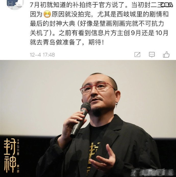 其实,关于这《封神》补拍一事,早在7月份时候传出消息了,只是当时还没很大的关注度。爆料中称由于某些原因,电影就没有拍完,尤其是西岐城里的剧情和最后的封神大典,然后有信息显示片方主创9月还是10月就去青岛做准备了。