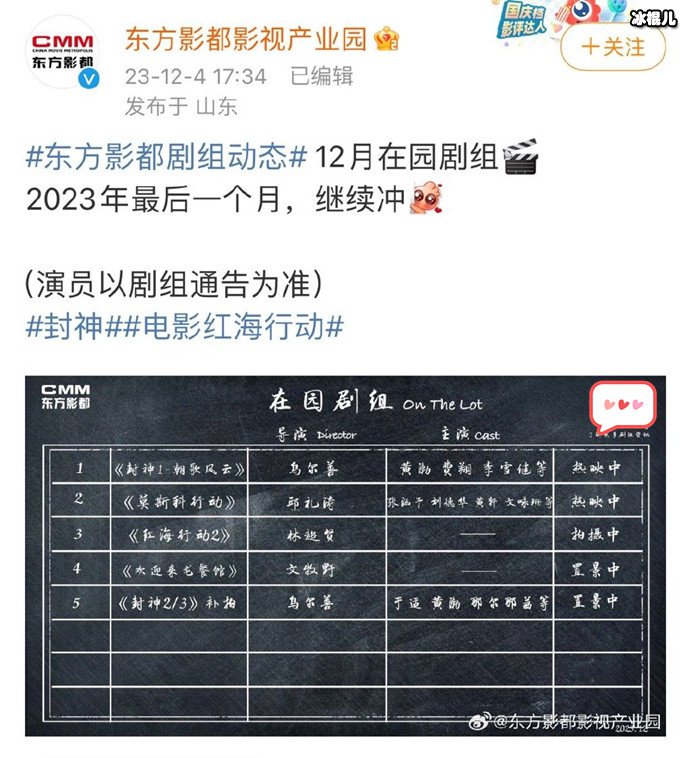 而在这一天,东方影都影视产业园发布了剧组的动态,称:“12月在园剧组2023年最后一个月,继续冲”。在园的剧组中显示,《红海行动2》拍摄中,《欢迎来龙餐馆》置景中,《封神2/3》也在置景中。但很快,这条动态就被删除了,具体原因不太清楚,这是被眼疾手快的网友给截图下来了。