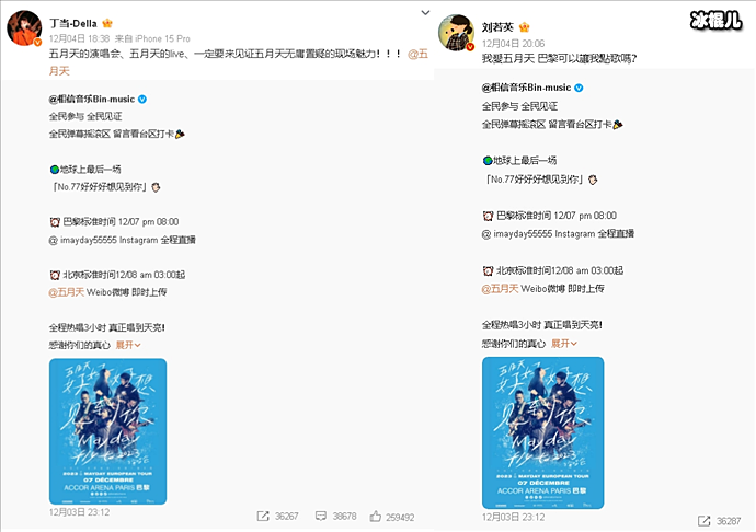 不久,丁当、刘若英和陈绮贞都力挺五月天,丁当发文表示:“五月天的演唱会、五月天的live、一定要来见证五月天无庸置疑的现场魅力!!!”刘若英是直接表白“我爱五月天,巴黎可以让我点首歌吗?”并都转发相信音乐发布五月天巴黎场直播演唱会。