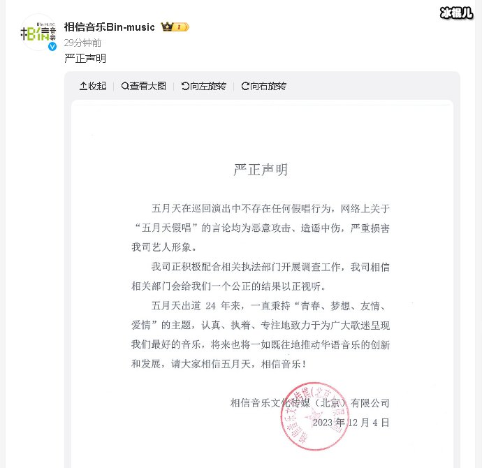 最近,五月天乐队的演唱会陷入假唱风波,五月天经纪公司相信音乐否认假唱并且发声明了,表示「五月天巡回演出中不存在任何假唱性行为,网络上关于“五月天假唱”的言论均为恶意攻击、造谣重伤,严重损害我司艺人形象。」