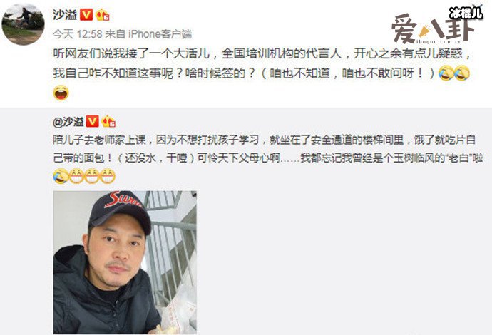 去年,沙溢送陪儿子去老师家上课,然后发文并配上自己在外面楼道吃面包的图,感受到做了父母不易,自我调侃了下“老白”形象不复存在。谁知莫名的成为了培训机构的“代言人”,随后沙溢幽默回应了培训代言,然后网友称沙溢是免费的素材慈父脸,太形象了。