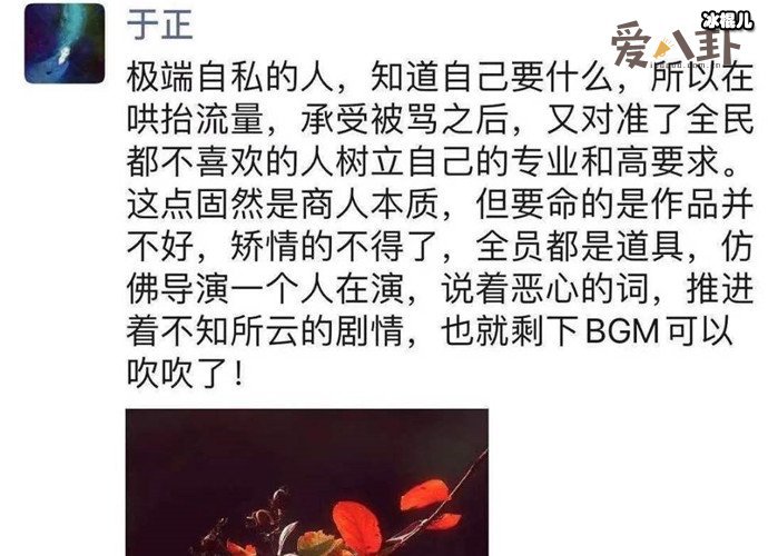 于正在娱乐圈是出了名的敢怼,而且怼的很在理,或许他对郭敬明的做法很不满且不认同,发文疑似力挺孟子义。称极端自私的人知道自己要什么,哄抬流量,承受被骂之后又对准全民不喜欢的人树立自己的专业和高要求。显商人本质,作品并不好,矫情的不得了,全员道具仿佛导演一个人在演,说着恶心的词,推进不知所云的剧情,也就剩下BGM可以吹吹了。