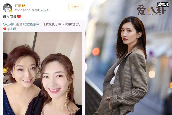由此,网友猜测可能是亲戚关系,说江疏影是江珊的侄女,可是,江珊出生于江苏镇江的星二代,好像是家里独生女,而江疏影出生于上海市,这已很明显两人不是亲戚关系。之后江珊和江疏影在国剧盛典上同框并晒出合照,配文称:“感谢国剧盛典,让我见到了传说中的妈妈”,江珊也互动评论称母女同框,江疏影回复称期待和妈妈有精彩合作。