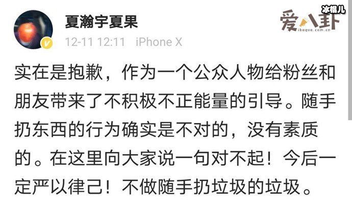 夏瀚宇道歉称,作为公众人物因不积极不正经能量的引导行为向粉丝及朋友抱歉,随手扔东西是不对的,没有素质的,向大家说句对不起,今后一定会严于律己,不做随手扔垃圾的垃圾。有网友表示素质底下,现在的爱豆越来越无语了,调侃称2020真是塌房之年。另有网友说正常,普通人也有这样的,希望夏瀚宇少抽烟伤身体,做歌手的就得好好保护嗓子。