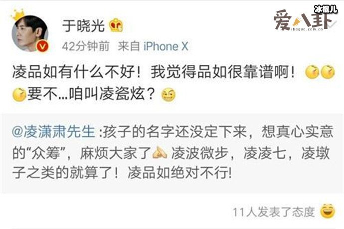 2019年,凌潇肃和唐一菲的二胎女儿出生了,凌潇肃晒了与女儿的照片,并发文说女儿是天上掉下来的凌妹妹,之后还向网友征集给女儿起名的微博。没想到这于晓光也来凑热闹,调侃了凌潇肃女儿的起名,顺带给凌潇肃女儿起来名字。