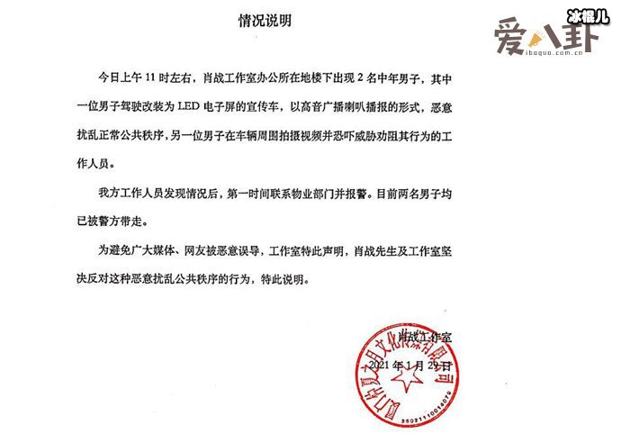 情况说明书里说,两名男子中一名用改装的LED电子屏宣传车,在楼下以高音广播喇叭播报的形式,扰乱了公共秩序。另一名就在宣传车的周围拍视频并恐吓威胁前来劝阻的工作人员。随后肖战工作室第一时间联系物业并报警处理,那两名男子已被制止并被警方带走。
