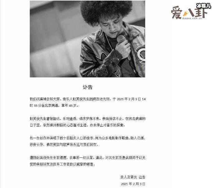赵英俊所创作的歌曲确实好听,但可惜斯人已逝,他的音乐会一直长存,他的笑容与歌声也阿金永远与我们同在。赵英俊遗愿说后事从简,感谢生前的亲朋好友及医务人员在他患病期间的关爱。赵英俊一路走好,永远的潇洒哥。