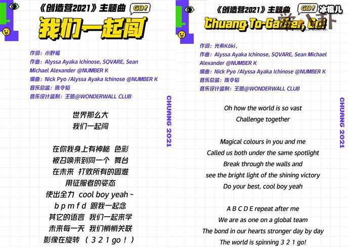 3月10日,《创造营2021》的选秀主题曲已公布了,这将会是有史以来难度系数在最高的一季主题曲了。因是打造国际青年文化交流男团,该主题曲分为中英双语版,中文版叫《我们一起闯》,英文版《Chuang To-Gather,Go!》。一起来欣赏下两版主题曲的歌词吧。