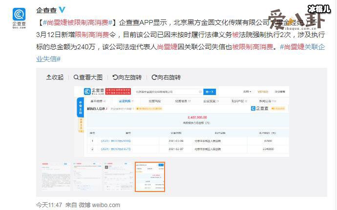 企查查APP方微博发文称,尚雯婕的公司黑金方圆文化,是在3月12日就被执行的限高消费,此前就因没有履行法律义务而被法院强制执行一次,这是2次了,总金额达到240万元。尚雯婕作为心上人的管理法人,因这一关联公司的失信,所以被限制了高消费。