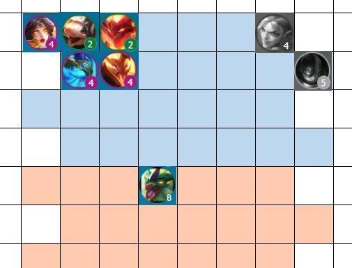 1.左下角:放置纳尔或阿卡丽,以便于他们在战斗中进行突袭和变形。
