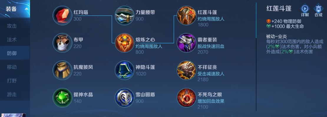 1.出装选择:选择“不死鸟之眼”作为首要出装,增加肉铠的生存能力和护盾效果。