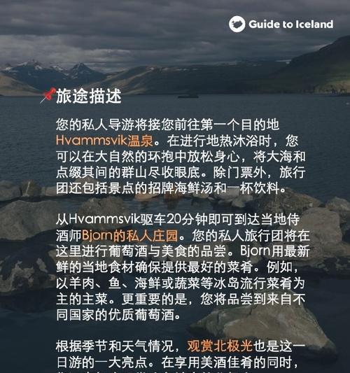 冰岛是一个充满惊喜和魅力的旅行目的地,通过本文提供的冰岛旅行攻略,读者可以更好地了解冰岛的风光与文化,并为自己的冰岛之旅做好充分准备。无论是追逐极光、沐浴温泉,还是品尝美食、领略文化,冰岛都将给您带来难忘的旅行经历。