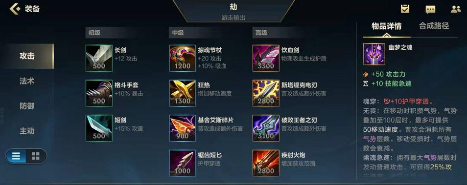 在游戏中,持续输出对于劫来说非常重要。幽梦之灵作为一件高攻速装备,能够提供额外的攻击速度和暴击几率,让劫的输出更加持久而可怕。