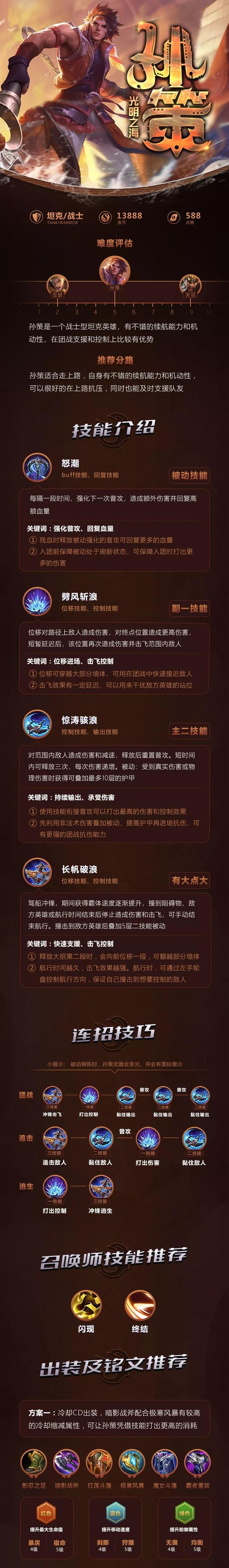 孙策的技能组合是其输出和控制的关键。在战斗中,玩家应合理释放孙策的技能,善于利用技能的位移和控制效果。比如,先使用1技能突进到敌方后排,再使用2技能进行大范围伤害,最后使用3技能进行大范围控制,可以有效地控制团战节奏。