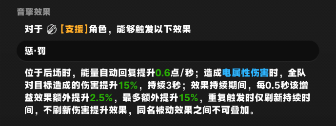 这个音擎效果中,能量自动回复是可以常驻的,所有支援角色都可以获得收益。第二个效果有一个大前提——造成电属性伤害时,才会触发。也就是说,只有能造成电属性伤害的角色才能获得这个效果的增益。如果角色无法造成电属性伤害,那么就可以当做没有这个效果了,几乎是白板。