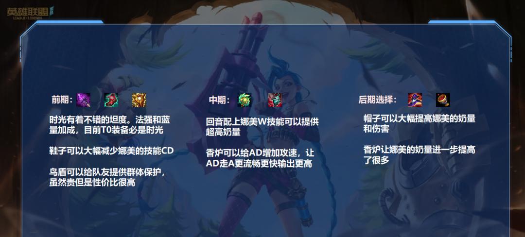 在装备选择方面,我们可以考虑选择提高法术强度、增加冷却缩减等属性的装备,以提升娜美的技能伤害和连招能力。