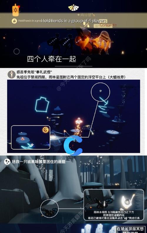 游戏中的互动是一大特点,每日任务中也有要求我们帮助其他玩家点亮蜡烛。这个任务比较简单,我们只需要找到其他玩家,将蜡烛点亮即可。不仅可以帮助其他玩家,还能让自己获得一些奖励。