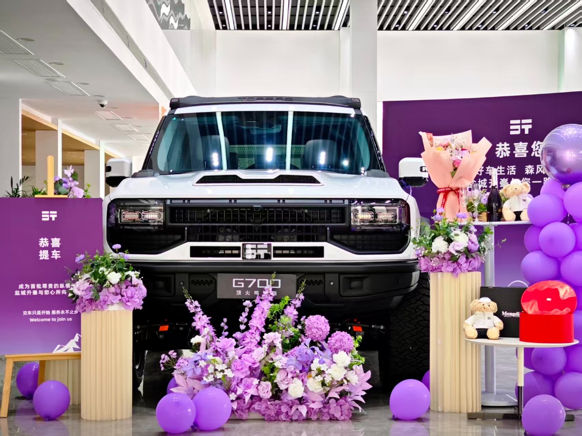 仪式现场,鲜花簇拥、氛围热烈,工作人员早已将这台纵横顶火鸣镝版精心装扮完毕,箭矢式前脸搭配科幻感车顶示廓灯,机甲越野气场拉满,每一处细节都彰显着专属定制的匠心与锋芒。