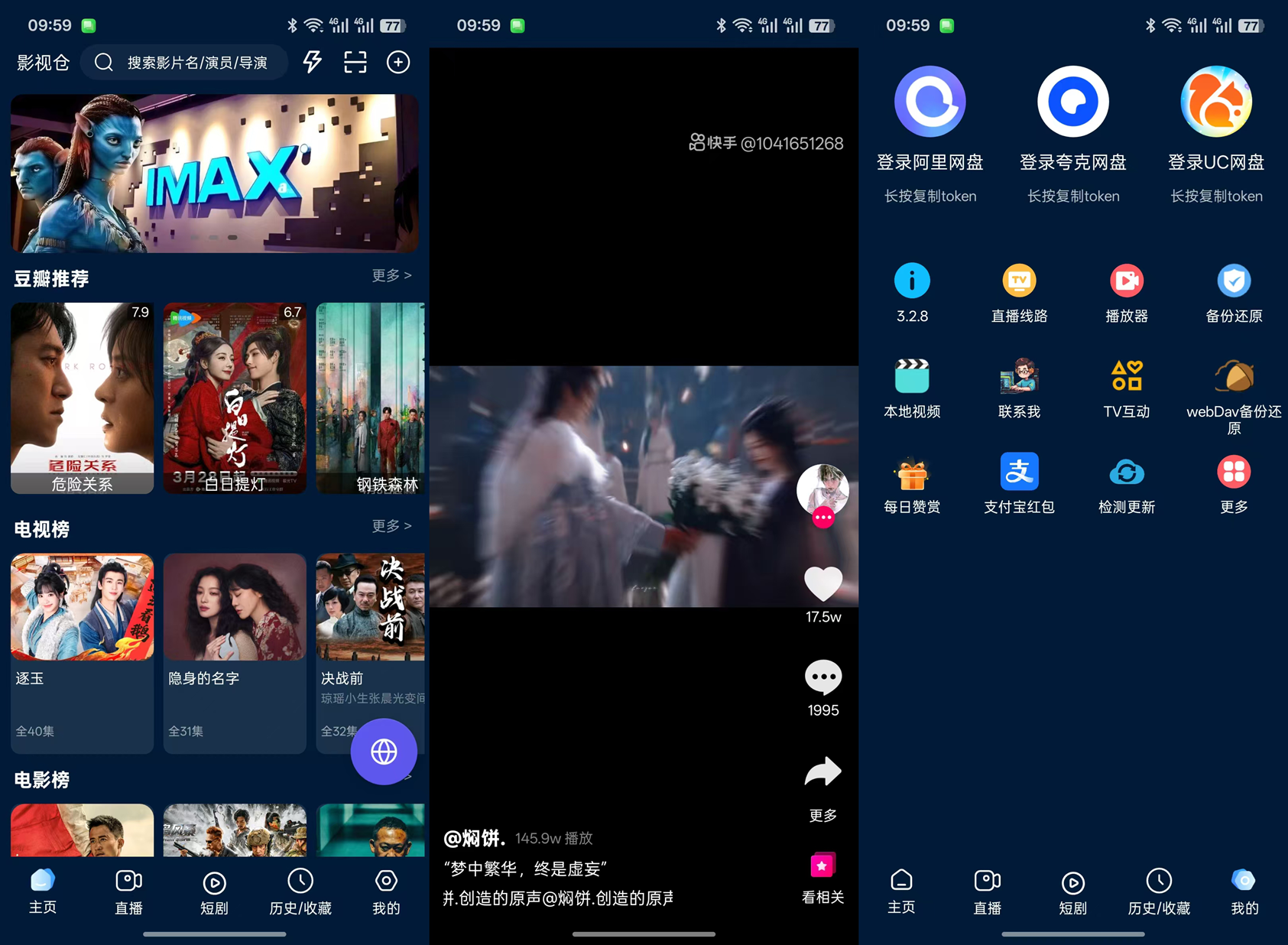 ☆影视仓是一款老牌聚合型影视播放器, 手机版3.2.8在原有基础上优化了播放器加载速度,新增内置解析线路并引入嗅探增强能力。应用支持阿里云盘、夸克盘、UC网盘等多个网盘登录,采用深色模式设计,集成直播、短剧、排行榜等功能模块,适合重度追剧和网盘用户。