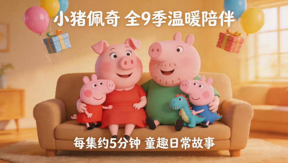【小猪佩奇 S1-S9 MP4】☆风靡全球的学前教育动画☆从第一季到第九季的完整剧集,将这部诞生于2004年的英国经典动画全貌呈现在你眼前。每集约5分钟的故事,围绕着一只名叫佩奇的可爱小猪和她的家人、朋友的日常生活展开,情节简单却充满童趣与温暖,至今已在全球超过180个国家和地区播出,成为无数孩子童年的温暖陪伴。☆动画片在全球180多个国家和地区热播,不仅成为学龄前儿童的最爱,还在社交媒体上掀起“社会人”等文化现象,成为一个跨越年龄层的文化符号。