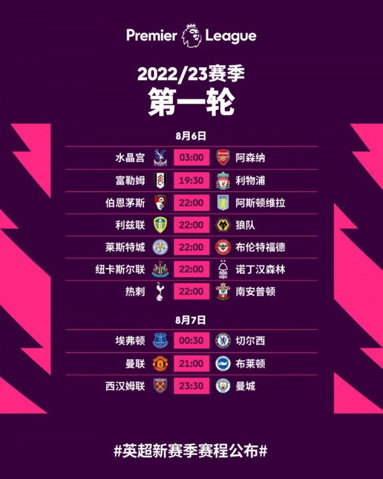 英超赛程:8月6日揭幕战水晶宫vs阿森纳,第16轮后为世界杯让路
