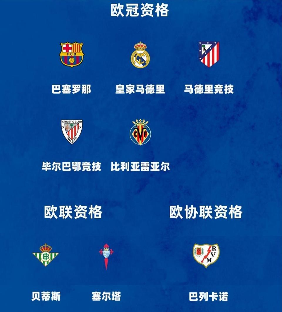 | 欧洲协会联赛(欧协联) | 1 个 | 国王杯冠军获取;若国王杯冠军已获欧战资格,则给联赛第 7 名 | 名额会根据国王杯冠军情况微调 |