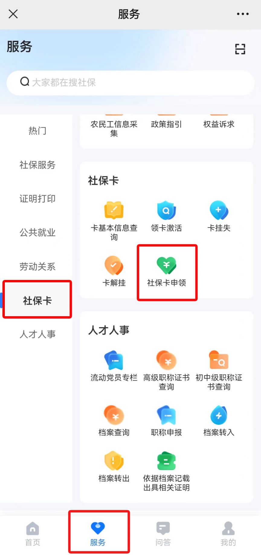 第一步:下载并打开 “智慧人社” APP,在下方引导窗口找到 “服务” 入口,点击 “社保卡” 事项,选择 “社保卡申领”。